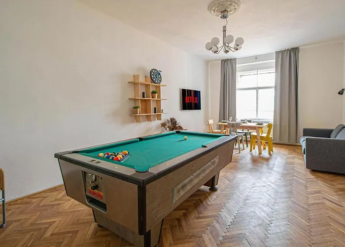 Este apartamento de 84 m^2 se encuentra en una parte antigua de Praga, a un corto paseo de la estación de metro Mustek. Super Central Billiard And Darts Big Apartment está a 16 minutos a pie del Museo época comunista en Praga. La Plaza de la Ciudad Vieja está a unos minutos andando del Super Central Billiard And Darts Big Apartment.